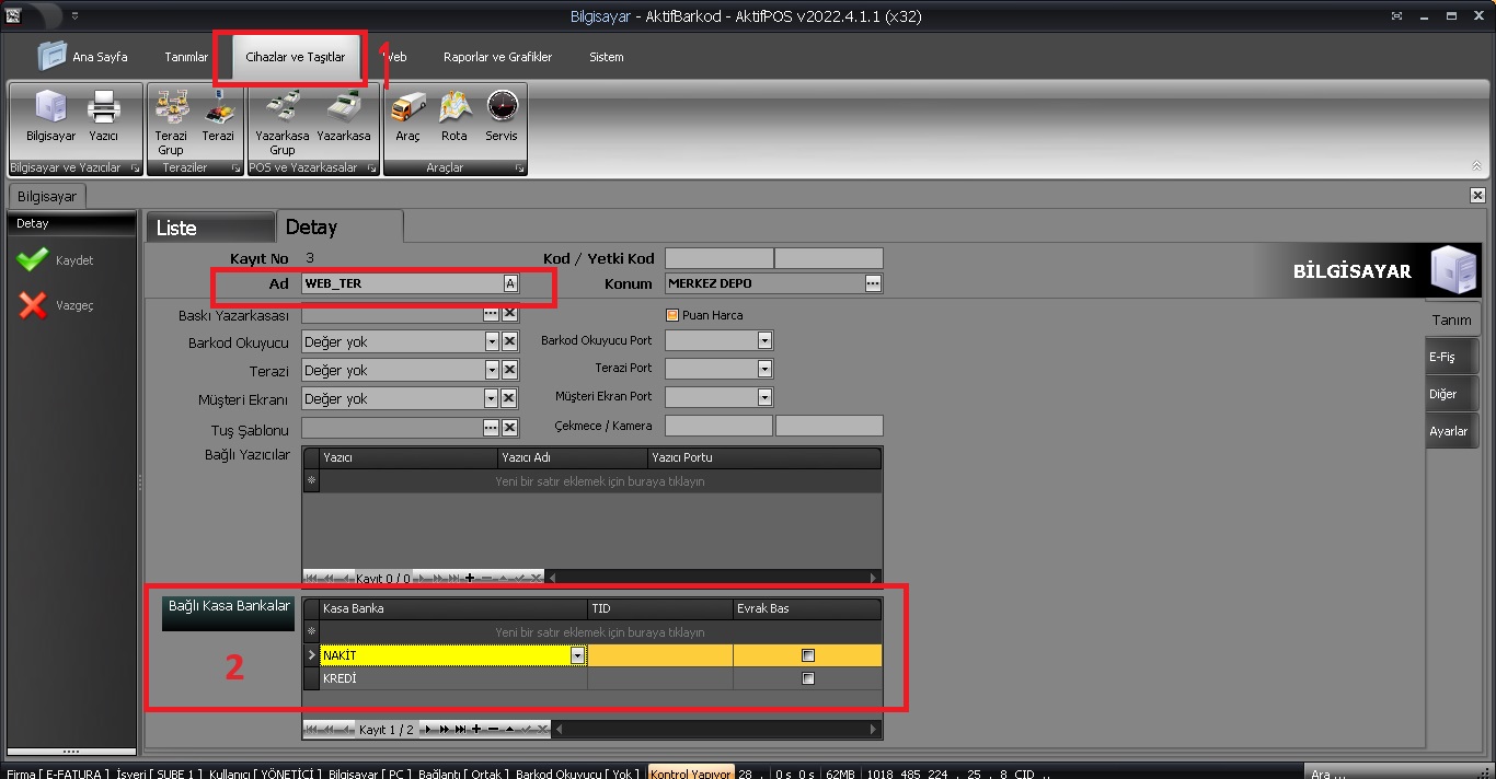 Cihazlar ve Taşıtlar>Bilgisayar menüsünden web_ ile başlayan bilgisayar detayına girin. Bağlı kasa bankalar kısmından ilgili kasa bankaları ekleyip kaydedin.