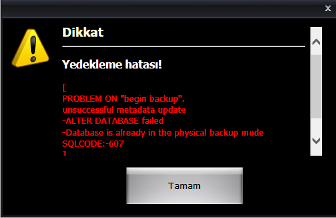 “anlık yedek” ayarının açık olduğu ve anlık yedek alınan yerlerde programın ilk açılışında karşılaşılan aşağıda yer alan resimdeki hatanın çözümü için Sistem>SQL Komut menüsünden sql komut penceresi açılır ve aşağıdaki komut yazıldıktan sonra F9 tuşuna basılarak komut çalıştırılır.