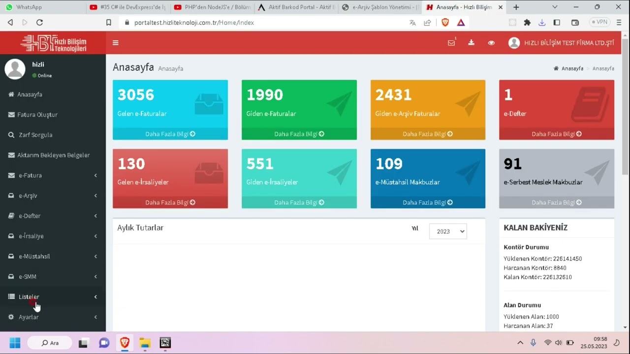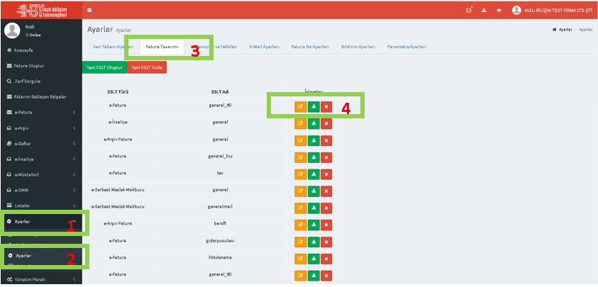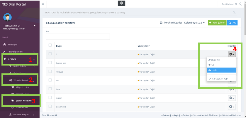 Şablonları indirmek için entegratör firmanın yönetim portalına girilir. Nesbilgi portalına giriş yapıldıktan sonra sol menüden, E-fatura>Yönetim Paneli>Şablon Yönetimine girilir. Burası test portalı olduğu için çok sayıda şablon yer almaktadır. Sizin panelinizde az sayıda şablon olacaktır. İstenilen şablon, işlemler menüsü altından indire tıklanarak kaydedilir. E-Arşiv faturası şablonu da aynı şekilde indirilir.