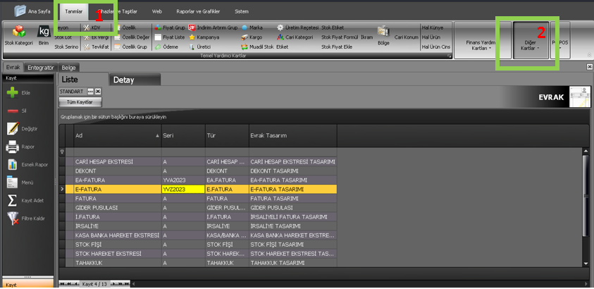 İndirilen şablonların her bir fatura serisi için programa kaydedilmesi gerekmektedir. Serileri görmek için Tanımlar>Diğer Kartlar>Evrak menüsüne girilir. Tanımlı e-fatura serileri ekranda görünecektir. Serilerin ilk üç karakteri kullanılacak olup serideki yıl bilgisi kullanılmayacaktır.