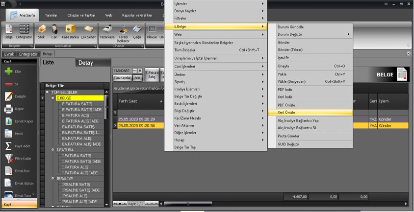 PDF önizleme ve XML önizleme olmak üzere iki tür önizleme yapılabilir. PDF önizleme faturanın evrak şeklindeki önizlemesidir. XML önizleme ise XML yapısının kontrolünün yapılması için kullanılabilir ve entegratöre gönderilen XML dosyasında bir hata olup olmadığı tespit edilebilir. Önizleme yapmak için e-fatura belgesine sağ tıklanır. E-belge menüsü altındaki PDF Önizle veya XML Önizle menülerinden birine tıklanır. PDF önizle menüsü ile belge gönderilmeden önce fatura kontrol edilebilir veya müşteriye gönderilerek kontrol etmesi sağlanabilir. XML önizlemede ise entegratöre gönderilen XML dosyasında bir hata olup olmadığı kontrol edilebilir.