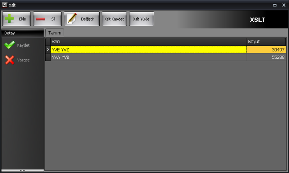 Şablonları programa kaydetmek için Entegratör menüsüne girilir. Entegratör kaydı seçilip sağ tıklanır ardından XSLT menüsüne tıklanır. Ekle tuşuna veya F8 kısayol tuşuna basılarak açılan ekrandan faturanın serisi yazılıp kaydedilir. . Aynı tasarımı kullanan farklı seriler var ise seriler arasına boşluk bırakılarak birden fazla seri girişi yapılabilir.