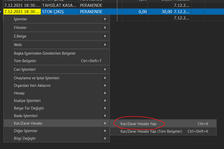 Önceden hesaplanmış Kar zarar hesabı yapmak için belge ekranında sağ tık yapılır. Ve işaretlenen yere tıklanır.